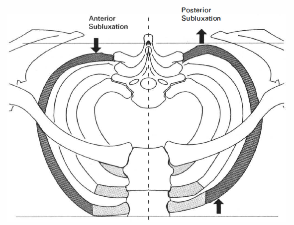 좌측 갈비뼈 2번이 바로 문제를 드러냈다. 뒤쪽으로, 즉 등쪽으로 밀려있으면서 정상적인 호흡 움직임에 제한이 있는 것이다. 이런 문제는 갈비뼈와 흉추간의 관절에 이탈이 있는 상태이고 흉추에서 뻗어나오는 교감신경절에 영향을 미칠 수 있다.