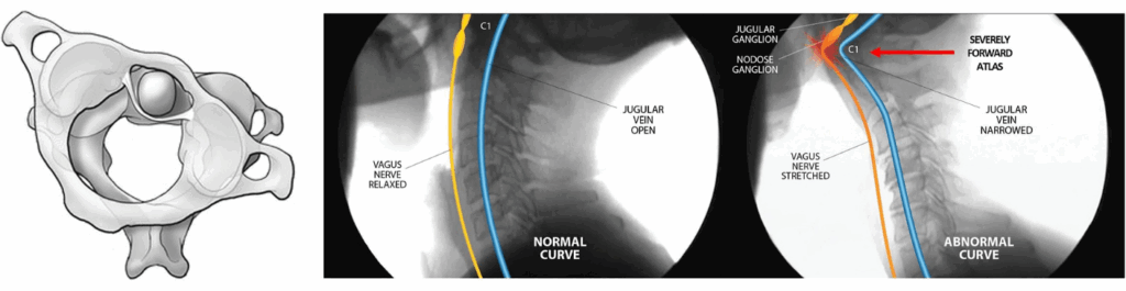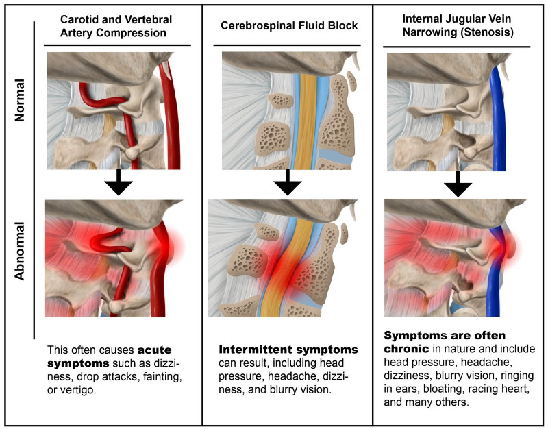 상부경추 앞에 가깝에 위치한 목혈관신경집(carotid sheath)의 신경과 혈관은 이런 변형에 특히 취약합니다. 두개골로 들어가고 나오는 혈관(내경정맥, 내경동맥)과 뇌신경 XI, XII, X, IX (미주신경, 부신경, 설학신경, 혀인두신경) 등이 목혈관신경집이라는 근막으로 둘러싸여 있습니다. 목혈관신경집은 Atlas의 가로돌기와 측두골의 경상돌기, 상인두수축근 사이 공간에 있습니다. 상부경추 Atlas, Axis의 이탈과 변형으로 인해 기계적 힘을 받거나 압박될 수 있습니다.
