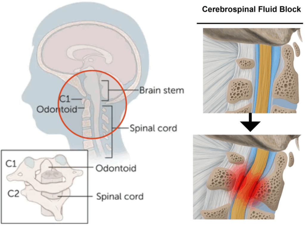 상부경추 영역에는 뇌로 들고나는 신경, 뇌줄기, 혈관, 그리고 두개바닥과 연계된 인대, 경막, 근육이 좁은 공간에 밀집해 있습니다. 이 때문에 상부경추 부정렬이 작은 범위에서 발생하더라도 주변 조직이 받는 영향은 클 수 밖에 없습니다.