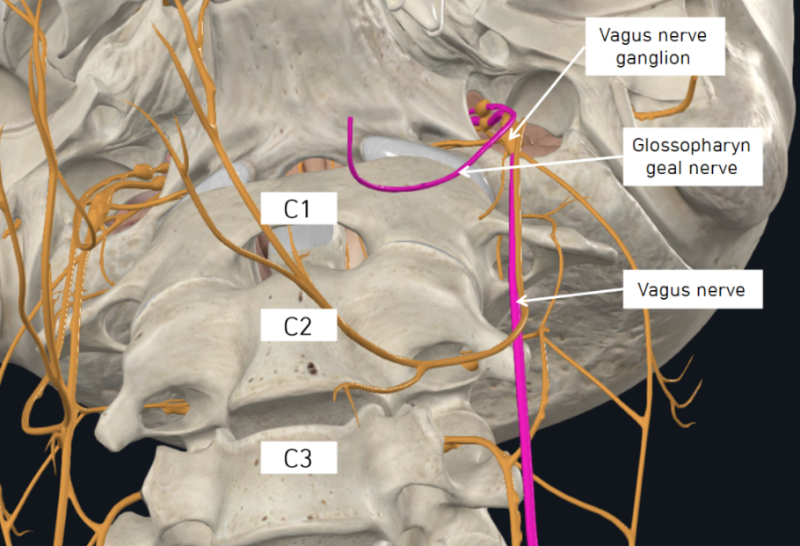미주신경은 뇌신경의 하나이자 자율신경계의 부교감신경으로서 우리 몸에서 매우 중요한 신경입니다. 미주신경은 가장 길고 넓게 퍼져 있는 신경인데 목 부위에서는 경추 양옆에서 가로돌기의 앞에 가깝게 놓여있기 때문에 상부경추의 부정렬로 인한 압박, 스트레칭, 당기는 힘에 취약합니다.