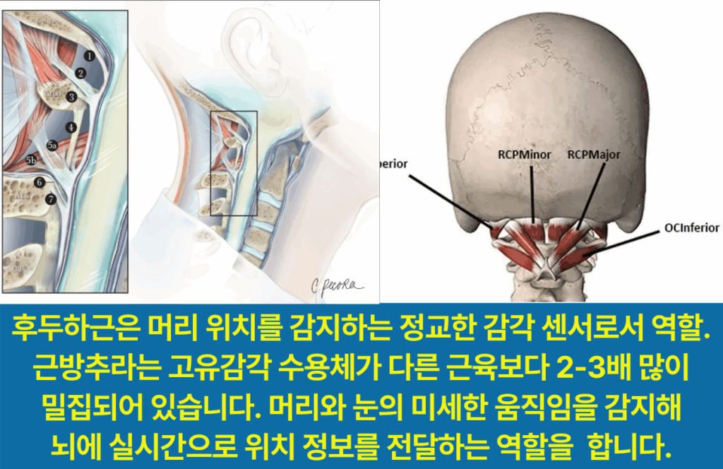 목에는 몸의 위치와 움직임을 감지하는 고유수용기가 다른 부위보다 2-3배 많이 집중되어 있는데 두개경추의 병변은 흔히 이 고유수용기를 장애 상태로 만듭니다.