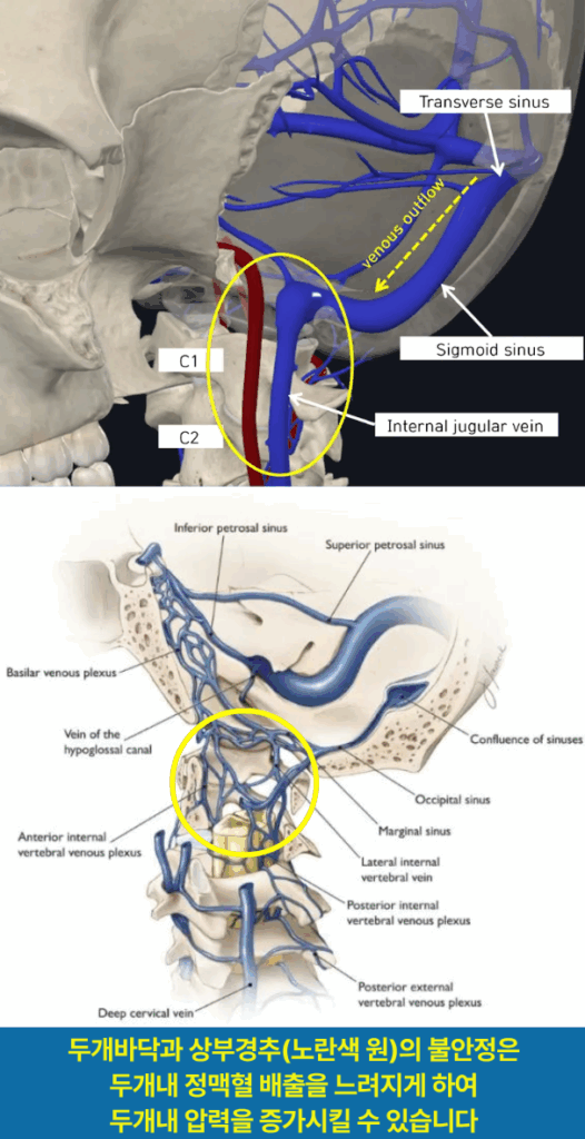 두개바닥의 긴장, 변형 등으로 인한 불안정은 경막과 두개내 막의 tension을 변형시킬 수 있습니다. 이런 막 긴장의 변형은 전정신경절과 교뇌, 연수로 연결되는 경로를 뒤틀거나 압박하여 신경기능을 왜곡할 수 있습니다.