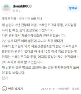 “2020년 이석증을 처음 겪고 이석치환술 후 남은 증상은 없었어요.” “한달전(2024년 9월) 이석증이 또 재발했어요. 이석치환술을 하고 힘든 증상은 사라졌는데 이번에는 이석이 다 들어간 느낌이 아니고…